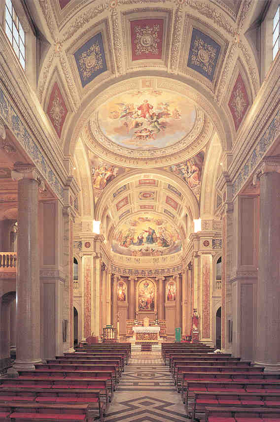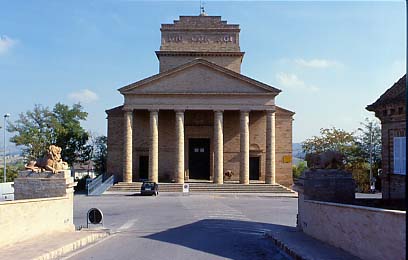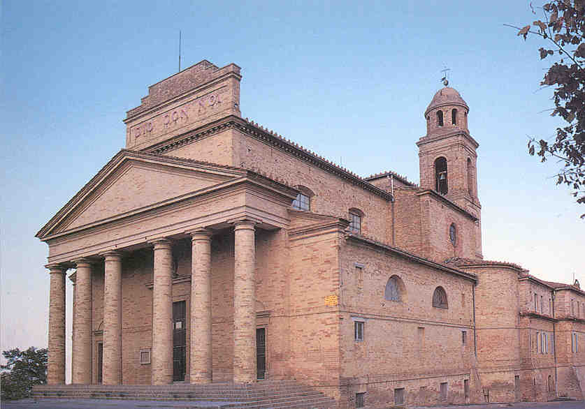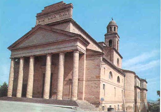 È tra i più interessanti esempi del neoclassicismo marchigiano, opera del grande architetto del Papa Giuseppe Valadier. La prima pietra fu posta nel 1799 ma i lavori iniziarono solo nel 1823 a causa dei tumultuosi eventi dell’età napoleonica. In data 6 maggio del 1859 si ebbe infine la solenne consacrazione. Vista la mole delle struttura e la limitatezza delle aree edificabili all’interno delle mura cittadine, il Valadier progettò un taglio delle mura orientali e un ponte a scendere per piazzare l’edificio monumentale fuori dall’abitato. La chiesa si presenta con una breve scalinata che da accesso al pronao, dotato di sei colonne doriche alte otto metri; la torre campanaria si erge “sottile ed elegante” dietro la curva dell’abside e culmina con un grazioso cupolino che raggiunge i quarantaquattro metri di altezza. L’interno diviso in tre navate, spiccano le decorazioni del fermano Pietro Lucchi e le grandi opere (tele, affreschi e tempere) realizzate dal celebre Luigi Fontana.